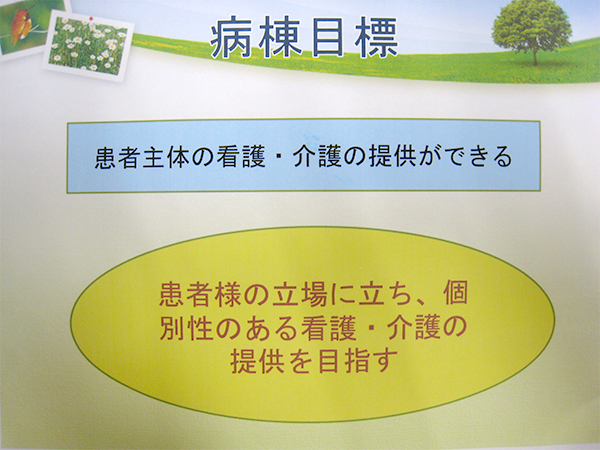 「患者主体の看護・介護の提供ができる」と病棟目標を掲げ、いつでも患者様の立場に立てる看護師・介護士でありたいと思っています。
