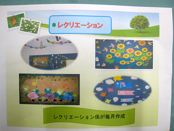 介護度の高い患者様が多い病棟ですが、毎月レクレーション係が中心となり、掲示板に季節毎の催し物を作成し、少しでも気分転換が図れるよう食事時に離床を行っています。